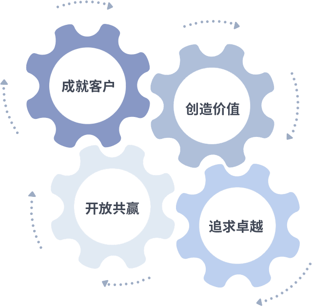 成就客户是一切决策的出发点,,,,创造价值是衡量所有工作的标准,,,,追求卓越是我们做事做人的态度,,,开放共赢是我们的格局也是最终的结果。。价值观的齿轮环环相扣,,,,推动着组织里的每个人不断向前。。。。