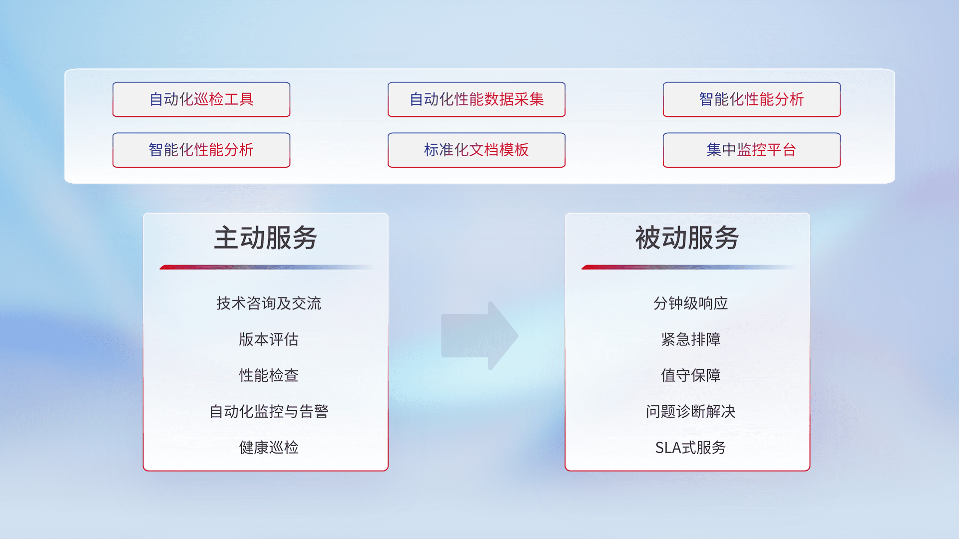 智能化工具和标准化文档,,,,保障服务质量,,提供主动服务(包含技术咨询、、、、版本评估、、性能检查、、自动化监控与告警、、、健康巡检)和被动服务包含(分钟级响应、、、紧急排障、、、、值守保障、、问题诊断解决、、、、SLA服务)。。。。